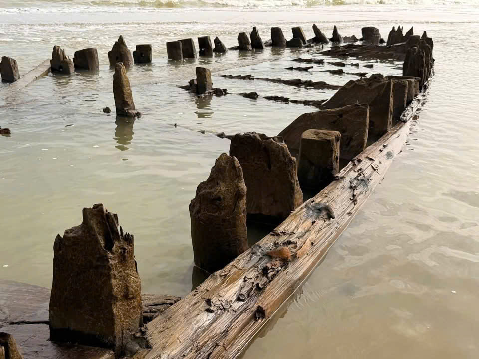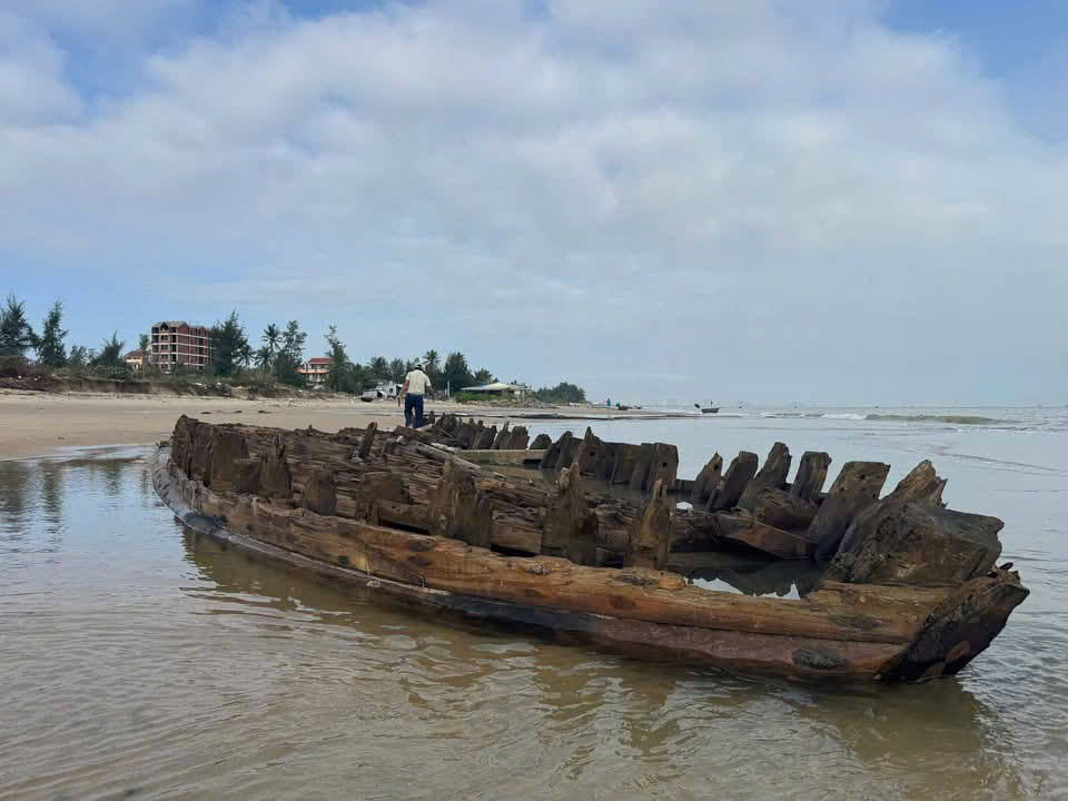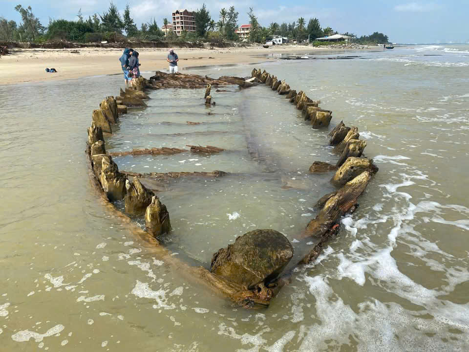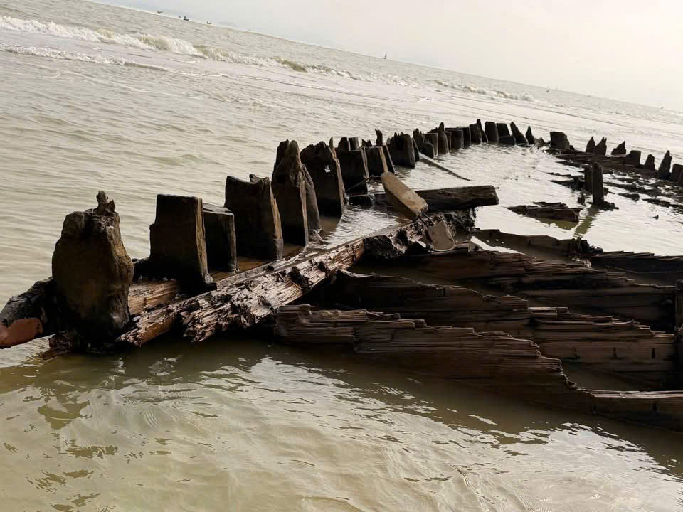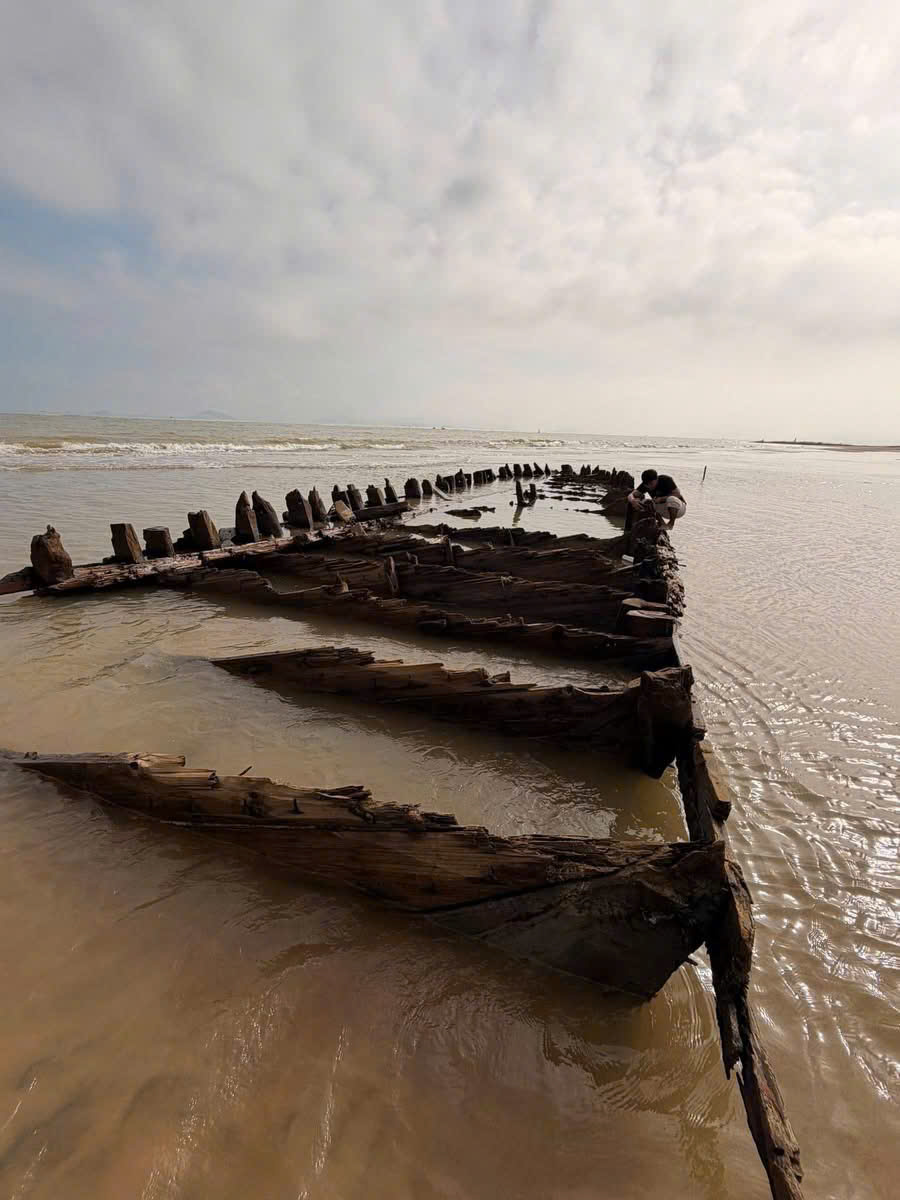 After Storm No.13, large amounts of sand were swept away, and this morning—at low tide—the ancient Cẩm An boat (Hội An) emerged more prominently than ever before. First discovered in December 2023, the vessel has puzzled researchers from the start. Why was it buried so deep within the sand dunes when this area has only recently been eroded? Just a few years ago, the shoreline was nearly a kilometer away.